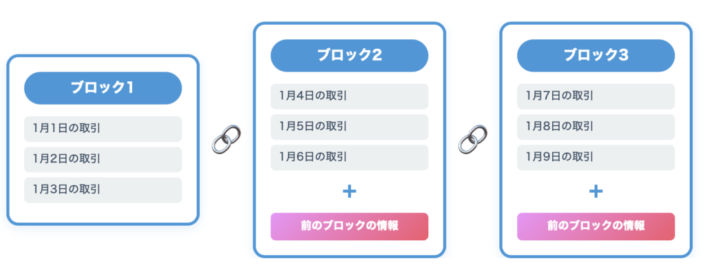ブロック3以降も同じように、必ず前のブロックの情報を持っているため、すべてのブロックが鎖のようにつながっています。