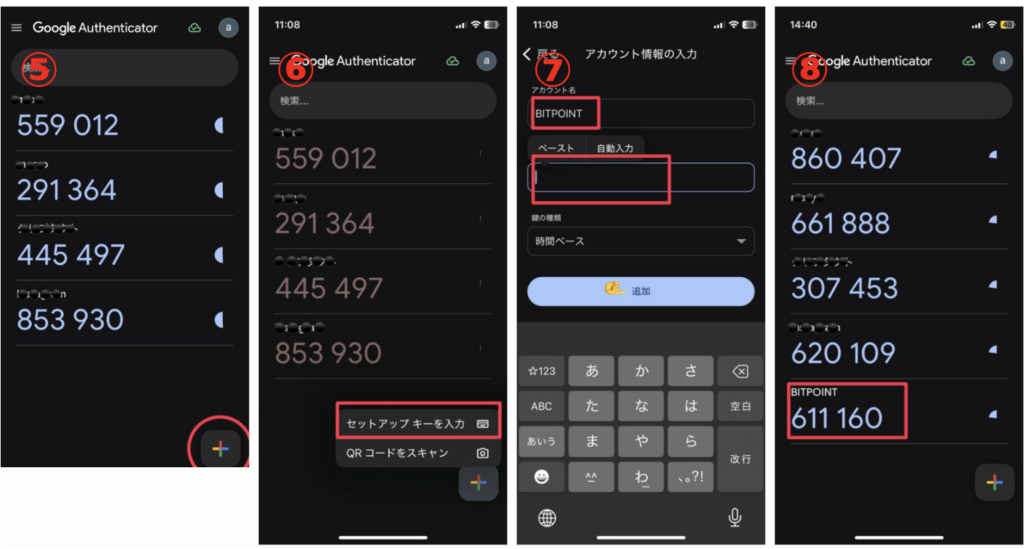 Google Authenticatorアプリを開き、次の手順で進めます。